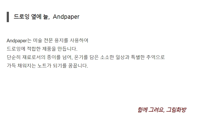 믿고 사는 앤드페이퍼라는 후기가 있었다. 음, 나는 처음보는데 괜찮은 곳인가보다.  그림화방 상품 판매 페이지에 간단한 앤드페이퍼 소개가 있다. 사이트는 찾지 못했다. 설명도 간결하고, 제품도 그러하다. 만족한다.