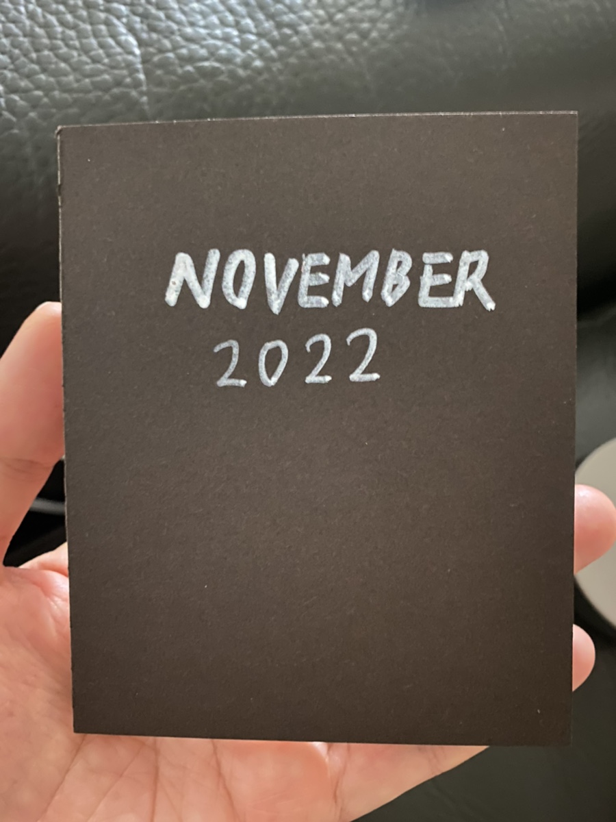 손바닥만 한 떡메에 NOVEMBER, 2022를 크게 적었다. 한 달에 한 권 스케치북을 끝내겠다는 의지! 12월이 되면, 이 스케치북이 머쓱해지도록, 무색하게. 1일 1그림을 그려야지! 그렇지만 너무 크면 부담스러울까 봐 선택한 사이즈인것 같다. 의욕과 소심함의 공존이 느껴진다.