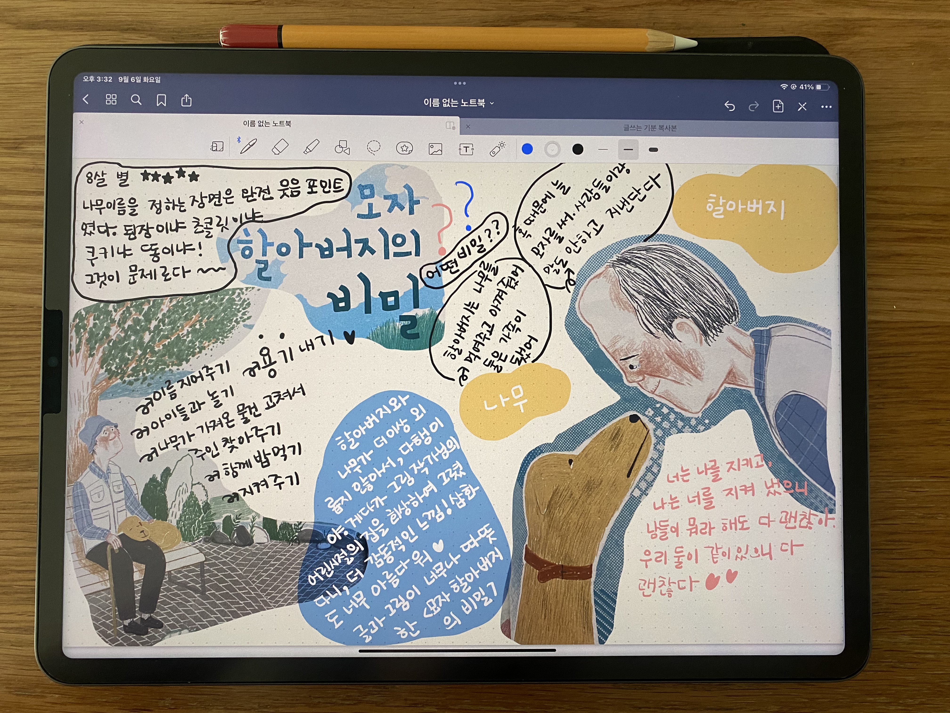 아이패드에 애플펜슬로 글씨를 써보면 뭔가 글씨의 시작과 끝이 착 달라붙는 느낌이 나지 않고 자꾸 날아가는 것 같아요. 프로크리에이트를 이용해 그림은 즐겨 그리는데, 굿노트에 필기를 하며 잘 활용하지는 못했어요. 여기에 바로 독서노트를 써볼까 몇 번 생각은 했었는데 역시 손글씨 맛이 좋아서 노트 필기를 하는 편입니다. 그런데 이번에 굿노트를 한번 활용해 봤고, 아직 어색하고 미숙한 면이 있지만 이미지를 활용할 수 있고, 자꾸 정리하다 보면 보기에 더 나아지겠지요. 그래서 한번 시도해 보았습니다. <모자 아저씨의 비밀>과 <친애하는 나의, 여행> 두 권을 정리했고 블로그에 공개해봅니다.