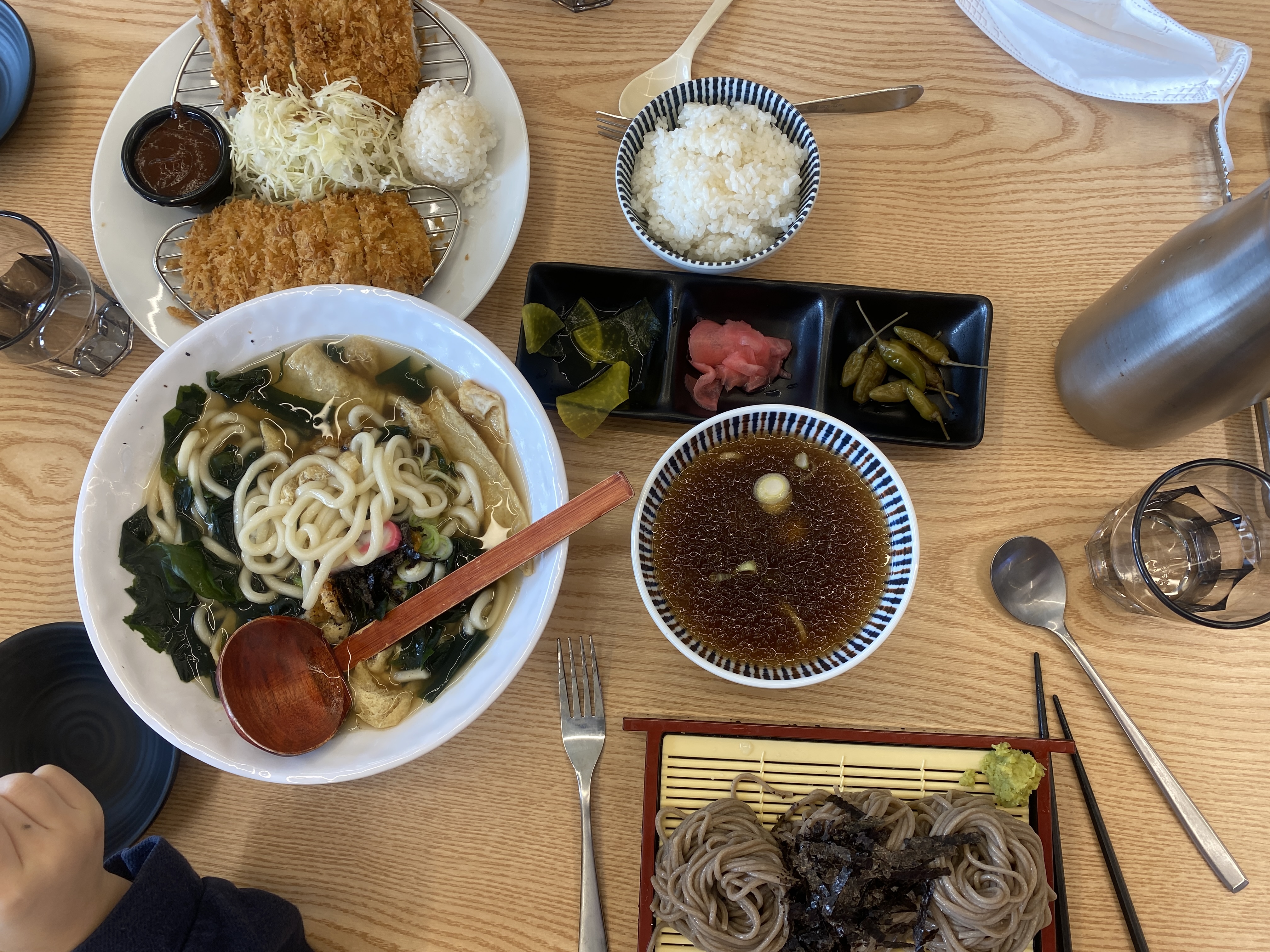정식은 싱글돈까스라, 욕심부렸네요. 그래서 돈까스 단품, 우동, 냉 메밀소바..이렇게 세개를 시켰습니다. ㅋㅋㅋㅋㅋ 좀 과했다 싶어요. 그런데 메밀소바 포기할 수 없었고, 애들은 소바 안먹으니 우동도 시켜야하고, 돈까스도 셋이 나눠먹으려면 더블은 되야 하잖아요. 아들이 공기밥 있어야 한다고 해서, 주문했더니 아이들이 우동도 거의 먹지 않아서 양이 지나쳤어요. ㅎㅎㅎ