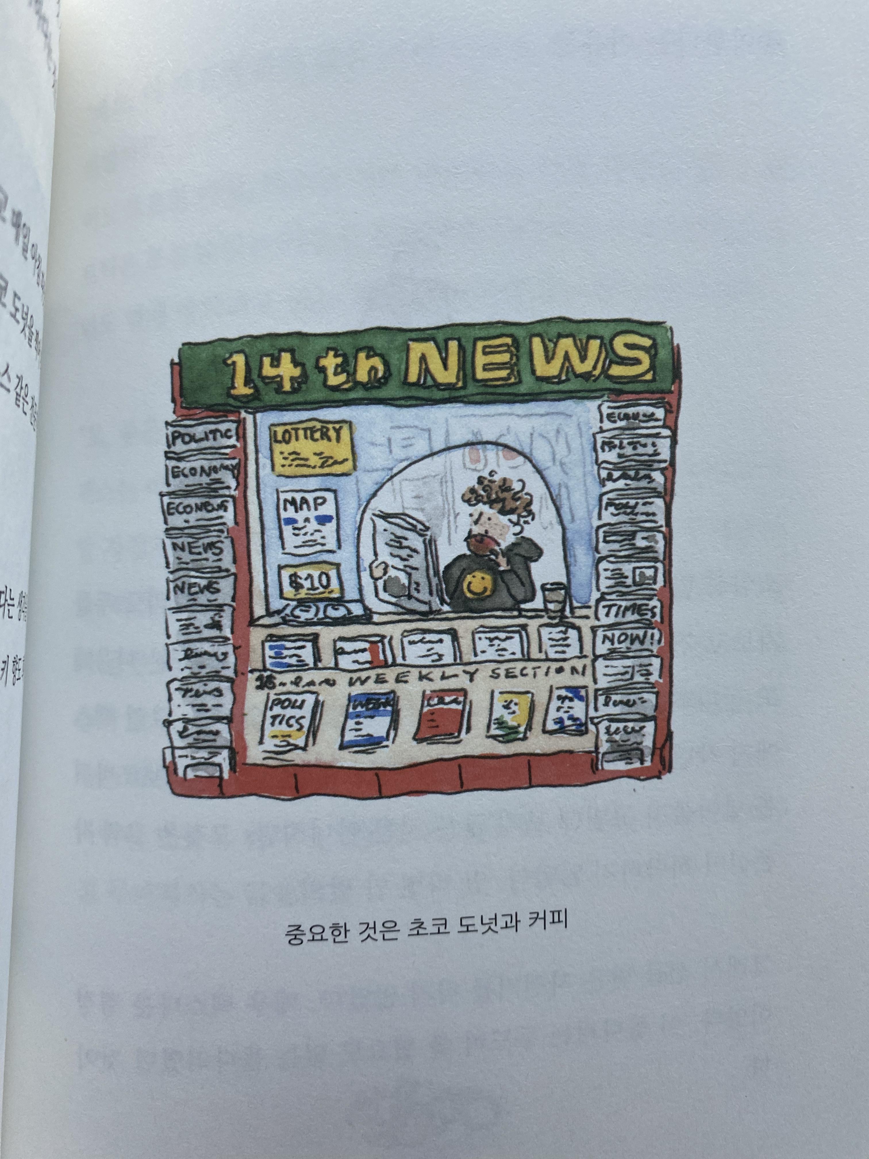 휴가동안 차에서 물놀이 하는 강가에서 책을 꺼내 읽으며 즐거웠어요. 저는 신문 가판대의 남자가 떠올라요. 중요한 것은 초코 도넛과 커피라는 그. 위에 그림도 한장 첨부 했지요.
