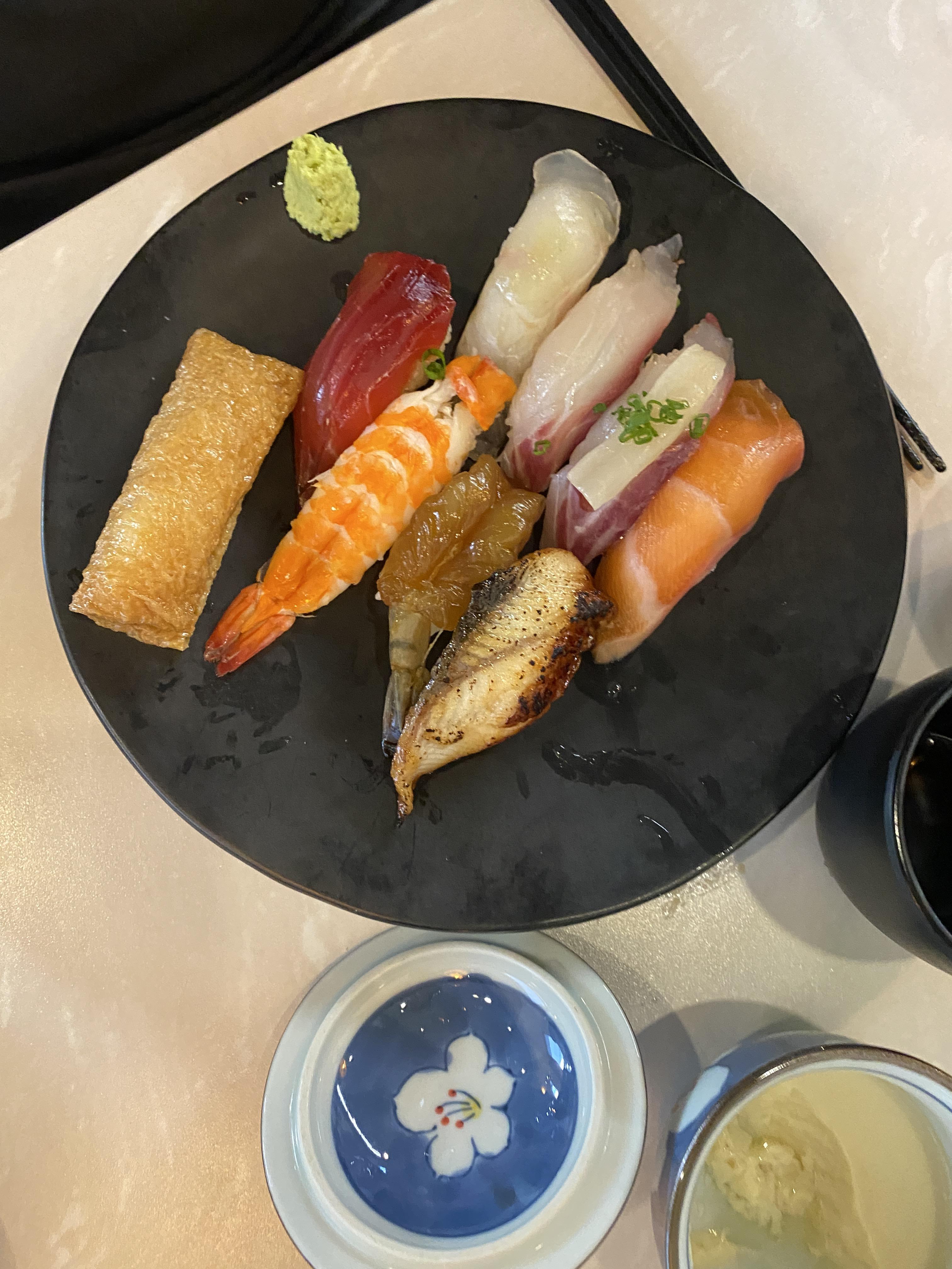 부드러운 계란찜이 기본으로 나오고, 테이블에서 초생강과 락교를 덜어 먹습니다. 아이들은 어린이초밥을 시켜줬는데, 유부와 계란초밥 및 아이들이 맛있게 먹을 수 있는 초밥 6피스가 6천원이에요. 저희 애들은 계란초밥 오직 하나만 먹어서, 그것만 부탁드렸어요.