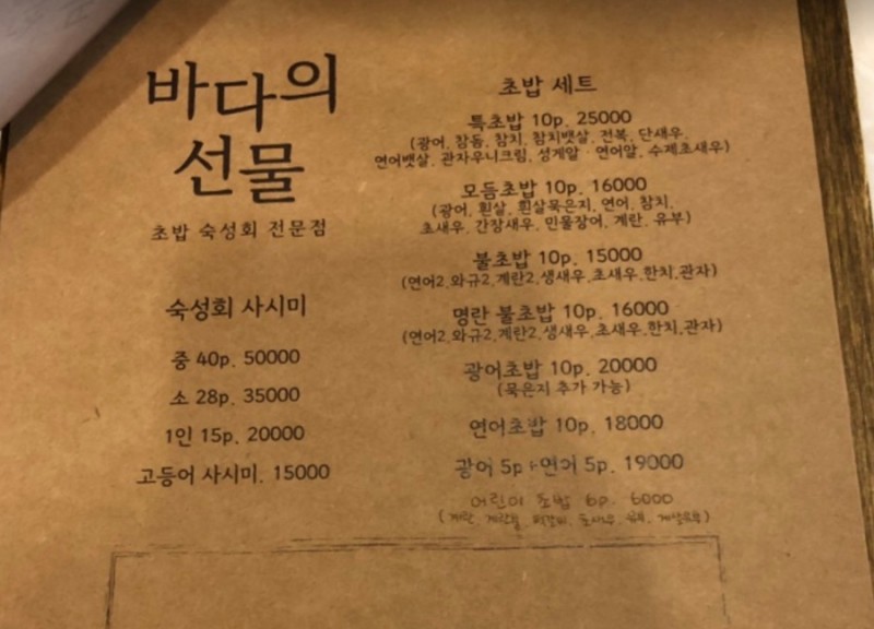 그러다 요즘 맘 카페에 핫한 스시집이라고 바다의 선물을 알았어요. 저에게 11자 상가 맛집을 소개해주는 친한 언니가 알려준 곳입니다. 그 언니가 맛있다고 한 곳은 죄다 제 단골집이 됐어요. 예를 들자면 불타는 292, 채돈이, 깡우동 등등등 ㅋㅋㅋㅋㅋ 사실 다 유명한 곳은 맞는데, 11자 상가를 잘 모르니까..언니가 가라고 한 곳만 가면 다 좋더라고요.